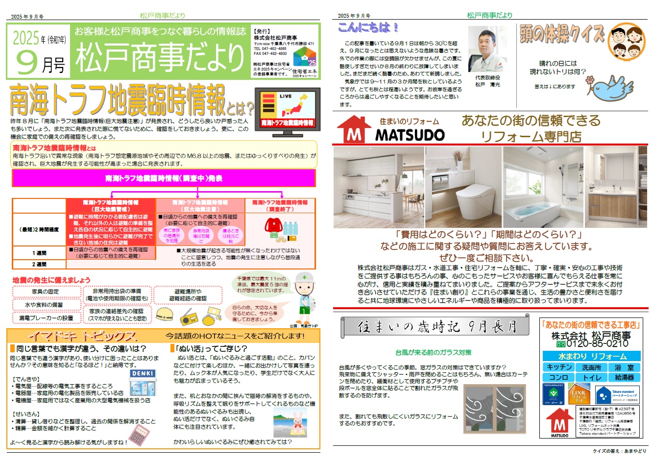 無料見積り・相談 電話で見積り・相談 0120-850-210 【受付】7:30~20:00【定休日】日曜日、祝日 電話で見積り・相談 HOMEイベント・チラシ情報チラシ松戸商事だより 2025年9月号 松戸商事だより 2025年9月号 一言 今月のテーマは「南海トラフ地震臨時情報とは?」。昨年発表されたのを覚えていますか?改めて防災意識を高めましょう。 チラシ一覧はこちら イベント・チラシ情報一覧はこちら 私たちについて 会社案内代表挨拶会社概要アクセスマップ 選ばれる理由 スタッフ紹介 施工事例 施工事例一覧 洗面 キッチン 浴室 トイレ お客様の声 お客様の声一覧 お役立ち情報 イベント・チラシ情報 リフォームの流れ よくある質問 ブログ 住宅省エネ2025キャンペーン 先進的窓リノベ2025事業 子育てグリーン住宅支援事業 給湯省エネ2025事業 お問い合わせ お問い合わせ 無料お見積もり HOME 会社案内 会社案内代表挨拶会社概要アクセスマップ 選ばれる理由スタッフ紹介 施工事例一覧 洗面 キッチン 浴室 トイレ お客様の声一覧 お役立ち情報 イベント・チラシ情報リフォームの流れよくある質問ブログ住宅省エネ2025キャンペーン先進的窓リノベ2025事業子育てグリーン住宅支援事業給湯省エネ2025事業 お問い合わせ お問い合わせ無料お見積もり © 2018 株式会社松戸商事