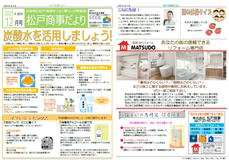 無料見積り・相談 電話で見積り・相談 0120-850-210 【受付】7:30~20:00【定休日】日曜日、祝日 電話で見積り・相談 HOMEイベント・チラシ情報チラシ松戸商事だより 2025年12月号 松戸商事だより 2025年12月号 一言 今月のテーマは「炭酸水を活用しましょう」。炭酸水は飲むだけじゃなく、色々と使い道があるんです。その他、季節のお役立ち情報等を掲載しています。 チラシ一覧はこちら イベント・チラシ情報一覧はこちら 私たちについて 会社案内代表挨拶会社概要アクセスマップ 選ばれる理由 スタッフ紹介 施工事例 施工事例一覧 洗面 キッチン 浴室 トイレ お客様の声 お客様の声一覧 お役立ち情報 イベント・チラシ情報 リフォームの流れ よくある質問 ブログ 住宅省エネ2025キャンペーン 先進的窓リノベ2025事業 子育てグリーン住宅支援事業 給湯省エネ2025事業 お問い合わせ お問い合わせ 無料お見積もり HOME 会社案内 会社案内代表挨拶会社概要アクセスマップ 選ばれる理由スタッフ紹介 施工事例一覧 洗面 キッチン 浴室 トイレ お客様の声一覧 お役立ち情報 イベント・チラシ情報リフォームの流れよくある質問ブログ住宅省エネ2025キャンペーン先進的窓リノベ2025事業子育てグリーン住宅支援事業給湯省エネ2025事業 お問い合わせ お問い合わせ無料お見積もり © 2018 株式会社松戸商事
