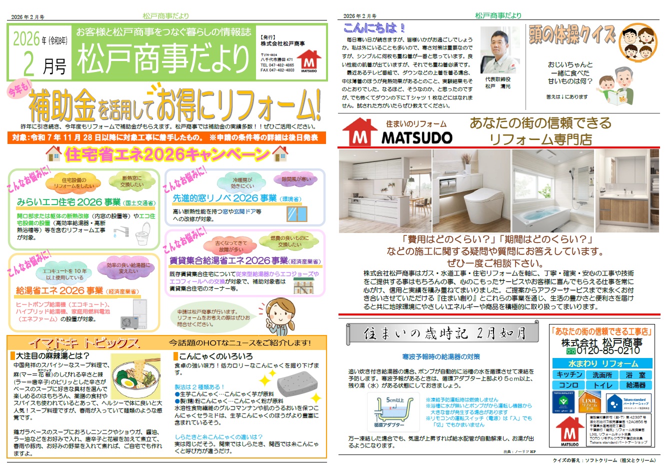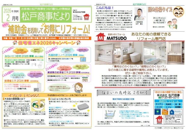 無料見積り・相談 電話で見積り・相談 0120-850-210 【受付】7:30~20:00【定休日】日曜日、祝日 電話で見積り・相談 HOMEイベント・チラシ情報チラシ松戸商事だより 2026年2月号 松戸商事だより 2026年2月号 一言 今月のテーマは「補助金を活用してお得にリフォーム!」。リフォームをお考えの方は、補助金実績多数の松戸商事にぜひお問合せ下さい。 チラシ一覧はこちら イベント・チラシ情報一覧はこちら 私たちについて 会社案内代表挨拶会社概要アクセスマップ 選ばれる理由 スタッフ紹介 施工事例 施工事例一覧 洗面 キッチン 浴室 トイレ お客様の声 お客様の声一覧 お役立ち情報 イベント・チラシ情報 リフォームの流れ よくある質問 ブログ 住宅省エネ2025キャンペーン 先進的窓リノベ2025事業 子育てグリーン住宅支援事業 給湯省エネ2025事業 お問い合わせ お問い合わせ 無料お見積もり HOME 会社案内 会社案内代表挨拶会社概要アクセスマップ 選ばれる理由スタッフ紹介 施工事例一覧 洗面 キッチン 浴室 トイレ お客様の声一覧 お役立ち情報 イベント・チラシ情報リフォームの流れよくある質問ブログ住宅省エネ2025キャンペーン先進的窓リノベ2025事業子育てグリーン住宅支援事業給湯省エネ2025事業 お問い合わせ お問い合わせ無料お見積もり © 2018 株式会社松戸商事