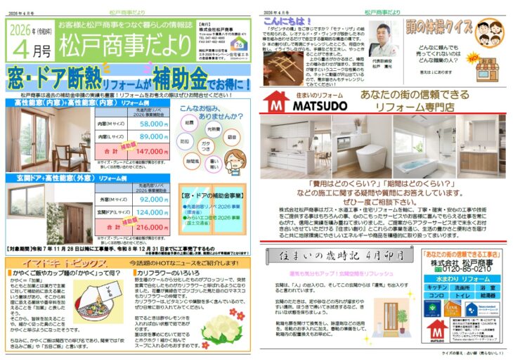 無料見積り・相談 電話で見積り・相談 0120-850-210 【受付】7:30~20:00【定休日】日曜日、祝日 電話で見積り・相談 HOMEイベント・チラシ情報チラシ松戸商事だより 2026年4月号 松戸商事だより 2026年4月号 一言 今月のテーマは「窓・ドア断熱リフォームが補助金でお得に!」。リフォームをお考えなら、ぜひ松戸商事にお問い合わせください! チラシ一覧はこちら イベント・チラシ情報一覧はこちら 私たちについて 会社案内代表挨拶会社概要アクセスマップ 選ばれる理由 スタッフ紹介 施工事例 施工事例一覧 洗面 キッチン 浴室 トイレ お客様の声 お客様の声一覧 お役立ち情報 イベント・チラシ情報 リフォームの流れ よくある質問 ブログ 住宅省エネ2025キャンペーン 先進的窓リノベ2025事業 子育てグリーン住宅支援事業 給湯省エネ2025事業 お問い合わせ お問い合わせ 無料お見積もり HOME 会社案内 会社案内代表挨拶会社概要アクセスマップ 選ばれる理由スタッフ紹介 施工事例一覧 洗面 キッチン 浴室 トイレ お客様の声一覧 お役立ち情報 イベント・チラシ情報リフォームの流れよくある質問ブログ住宅省エネ2025キャンペーン先進的窓リノベ2025事業子育てグリーン住宅支援事業給湯省エネ2025事業 お問い合わせ お問い合わせ無料お見積もり © 2018 株式会社松戸商事